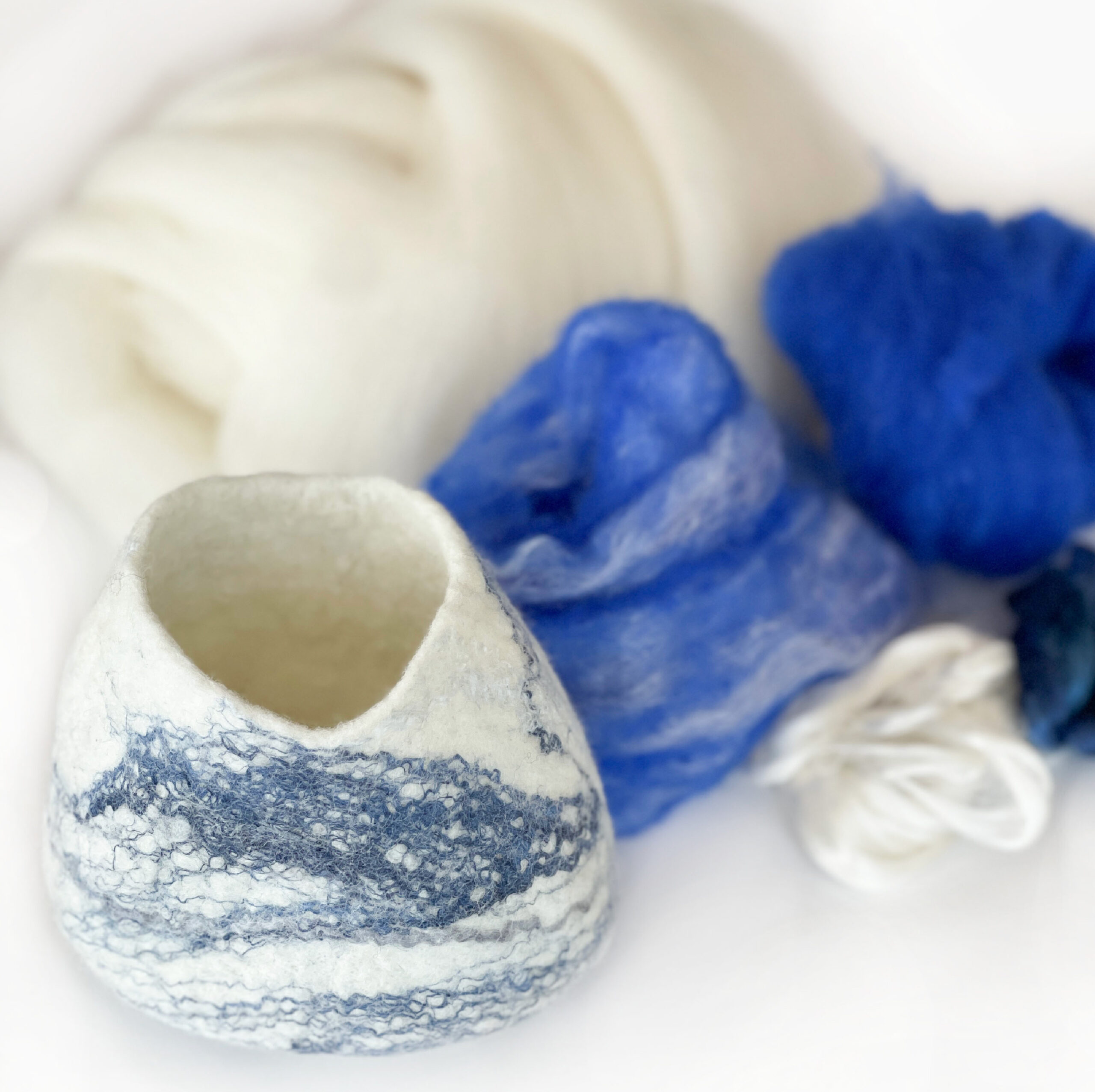 Create a sculptural felted pod inspired by rocky coastlines, sea-washed pebbles, and the calming blues and whites of waves coming ashore.